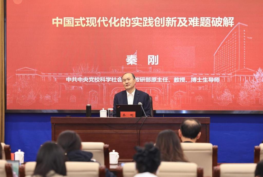中央党校(国家行政学院)科社教研部原主任、《理论视野》杂志主编秦刚教授作了题为《中国式现代化的实践创新及难题破解》的主旨发言,系统阐述了中国式现代化的实践创新、难题破解与重要经验。他认为,中国式现代化致力于在经济、政治、法治、文化、社会与生态等多维度实现探索突破,着力破解规模与质量、公平与效率、物质与精神、人与自然以及“国强必霸”传统逻辑等一系列世界性难题,并在此基础上总结了推进中国式现代化的五条重要经验,为理论体系的完善提供了重要支撑。
