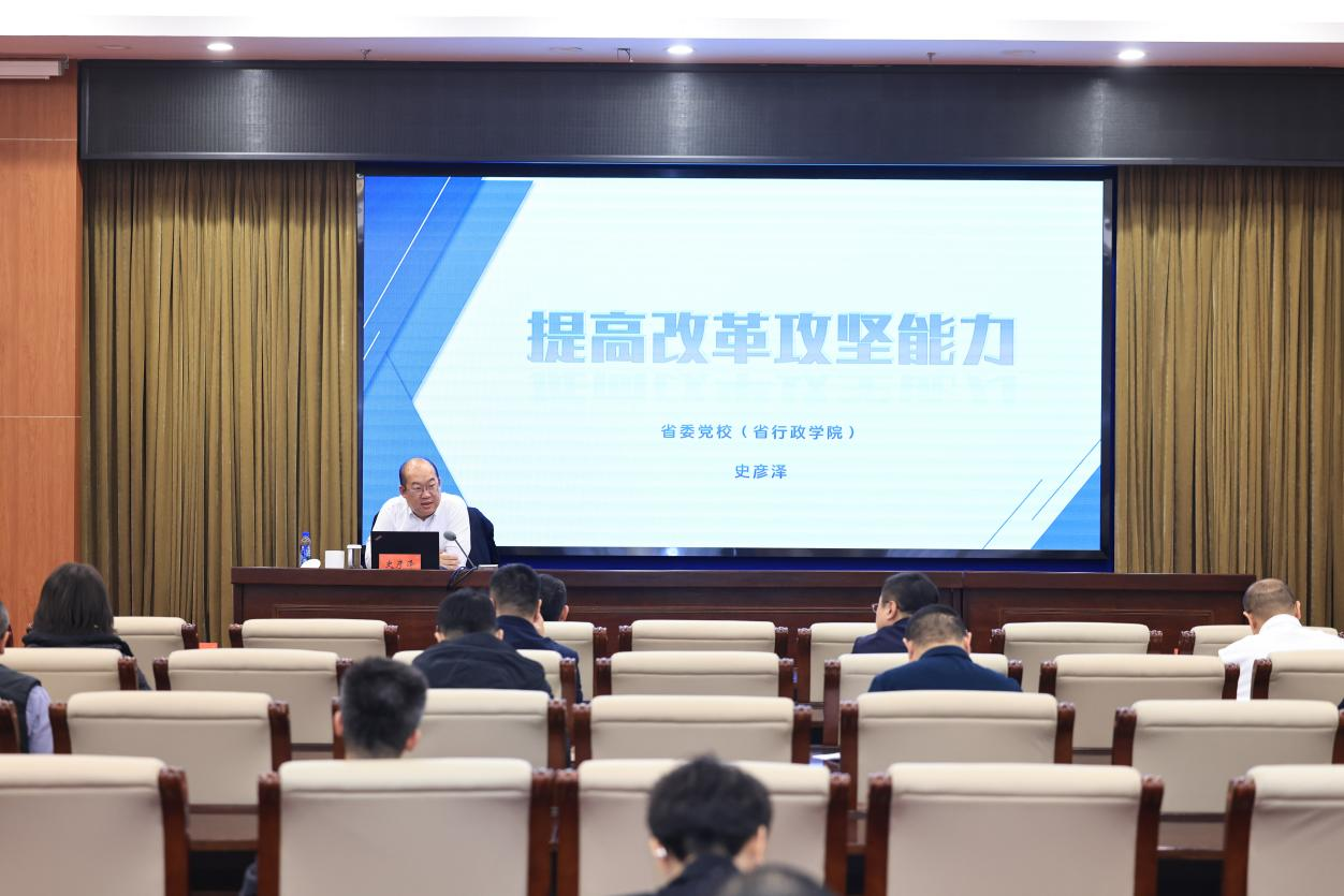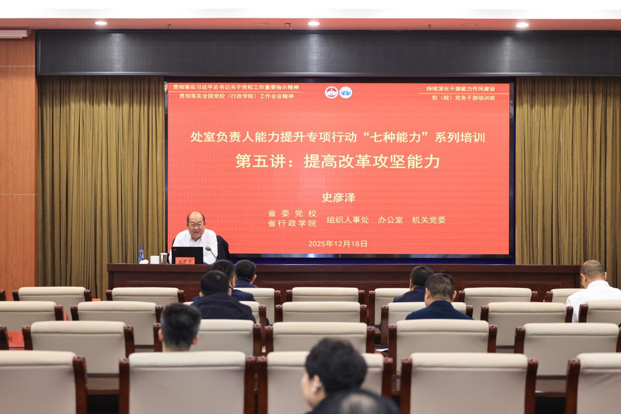 12月18日,省委党校(省行政学院)以“学理论·强党性·转作风·提能力”为主题,持续推进“处室负责人能力提升专项行动”,聚焦习近平总书记要求领导干部必备的“七种能力”开展系列培训。校(院)教育长史彦泽以《提高改革攻坚能力》为题作专题授课。全校(院)副处级以上党员干部、各支部党务工作者参加学习。