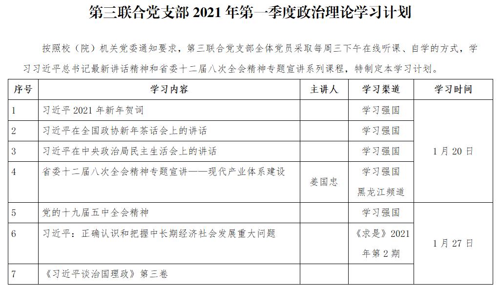 第三联合党支部2021年第一季度政治理论学习计划