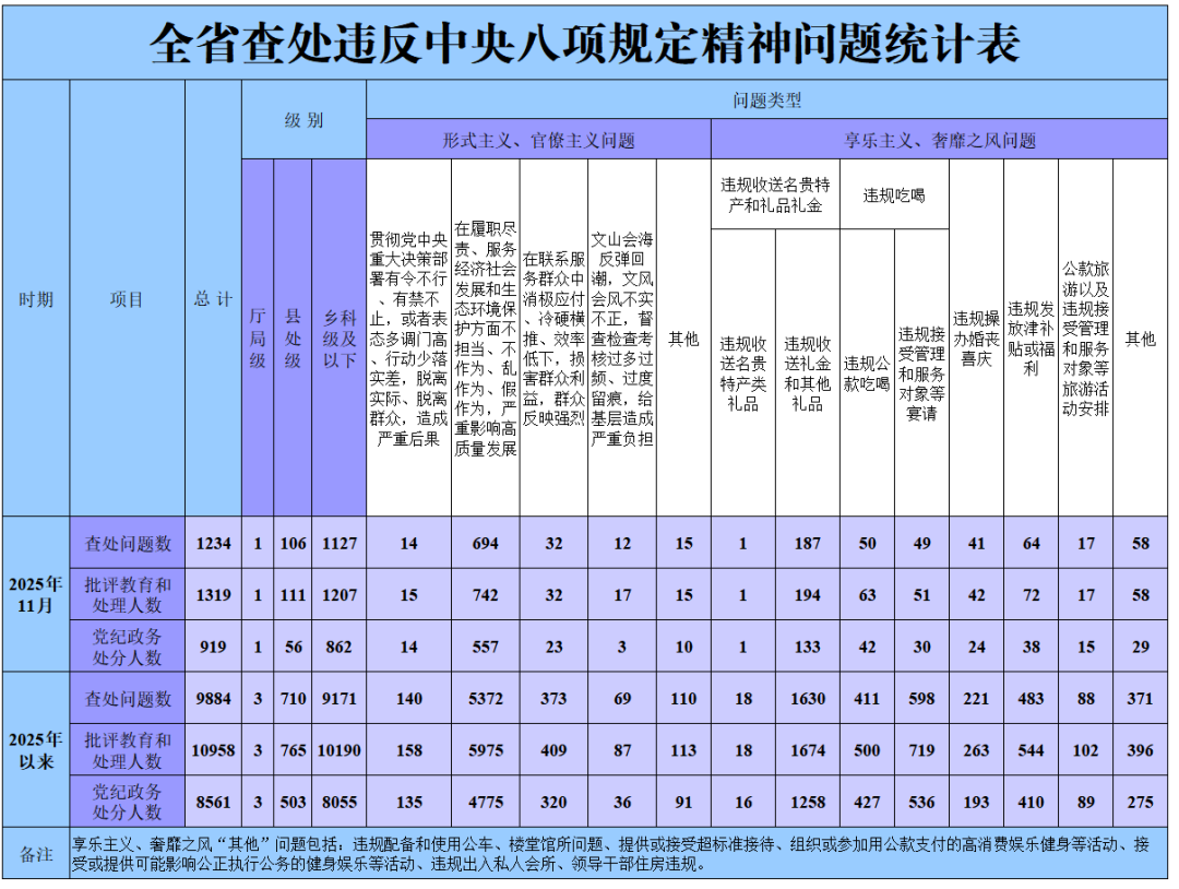 2025年11月黑龙江省查处违反中央八项规定精神问题1234起